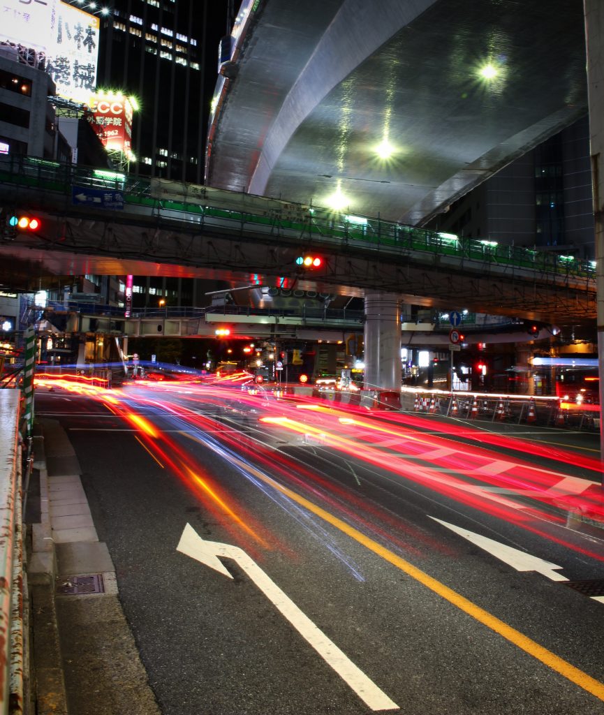 奥の車線と手前の車線の遠近感と車線の向きを意識。行き交う車のライトの色の種類や信号のタイミングなど一度にたくさんの事を考えるので難しくて混乱しがちですが、こういうのは「そういうことも考えると良い」くらいにとどめて、とにかく撮ること。枚数こなせば自然と掴んでくるものだと思います。